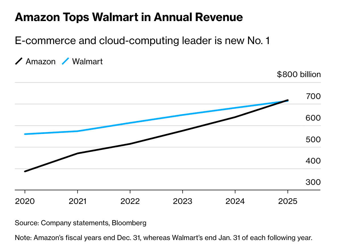Bloomberg reports that Amazon’s annual revenue has now exceeded Walmart’s, officially making it the world’s largest company by sales in 2026.